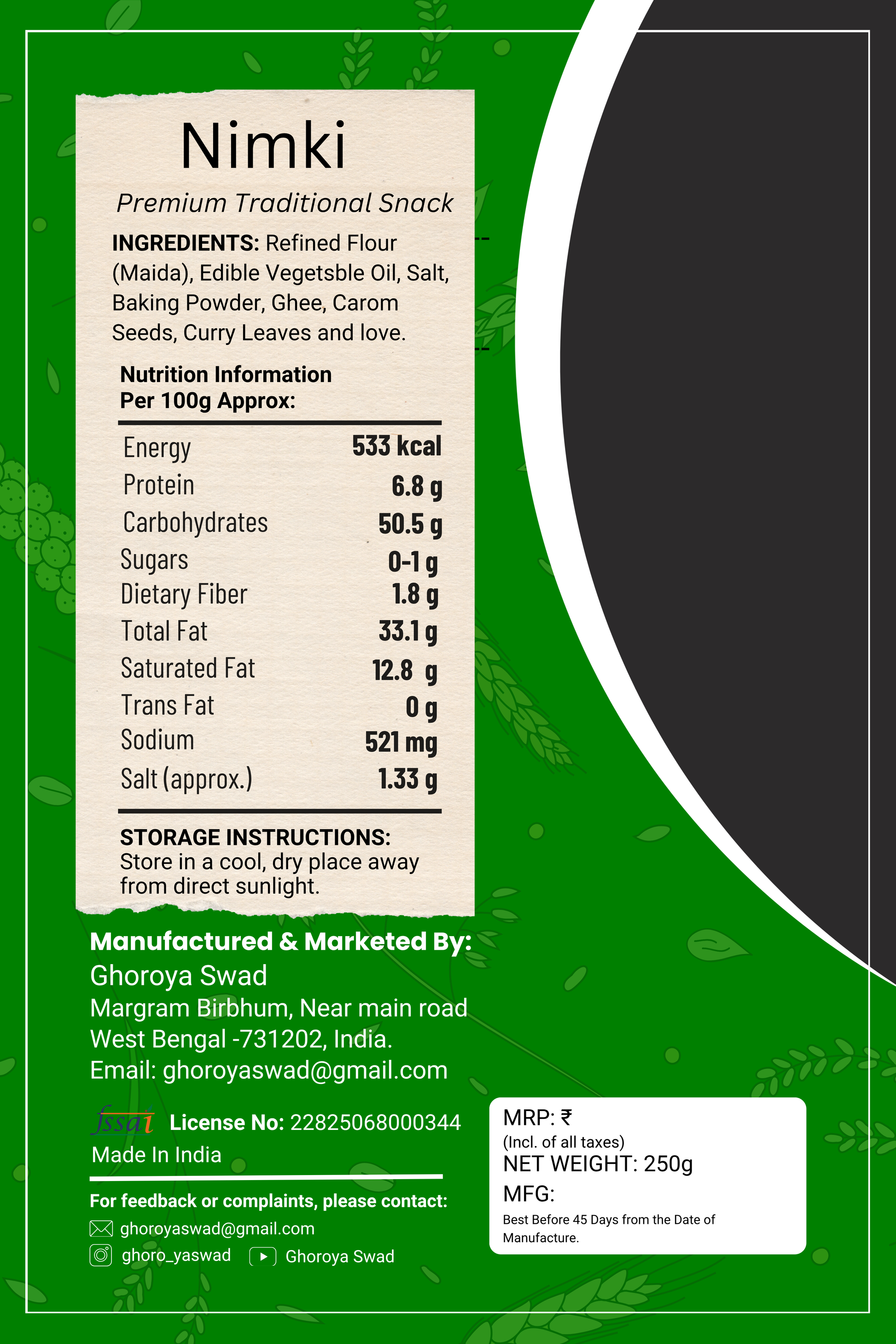 Our Nimki is 100% natural — we use no artificial colours, no preservatives, and no added chemicals. Just pure ingredients, hand-mixed and fried to perfection for that classic homemade taste.